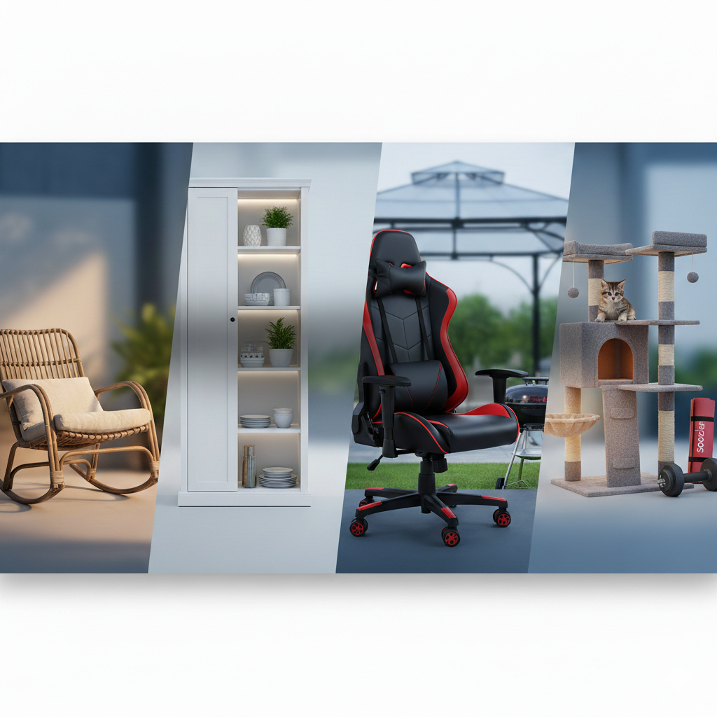 sofas, tables, armoires de cuisine, rangement, décoration, literie, salle de bain